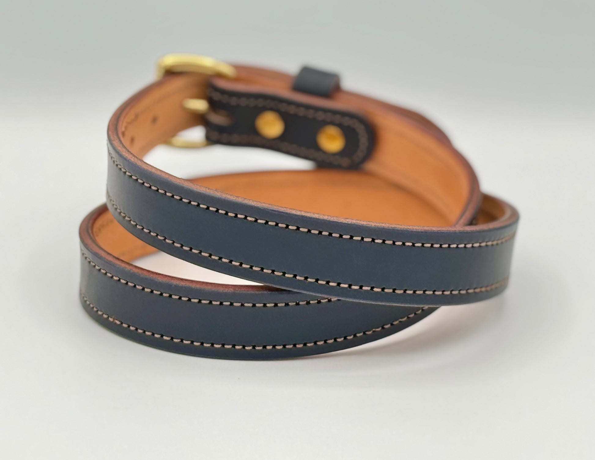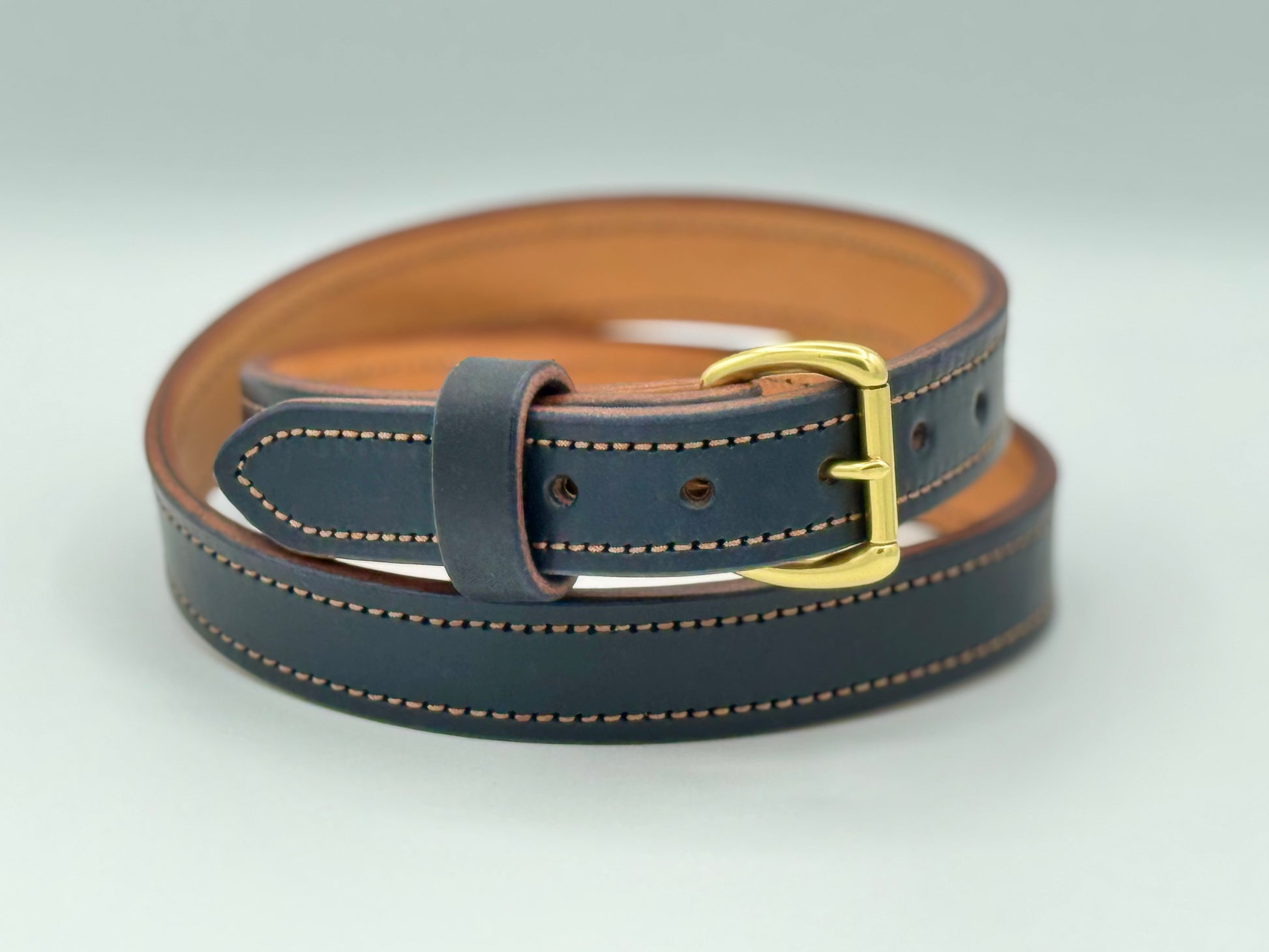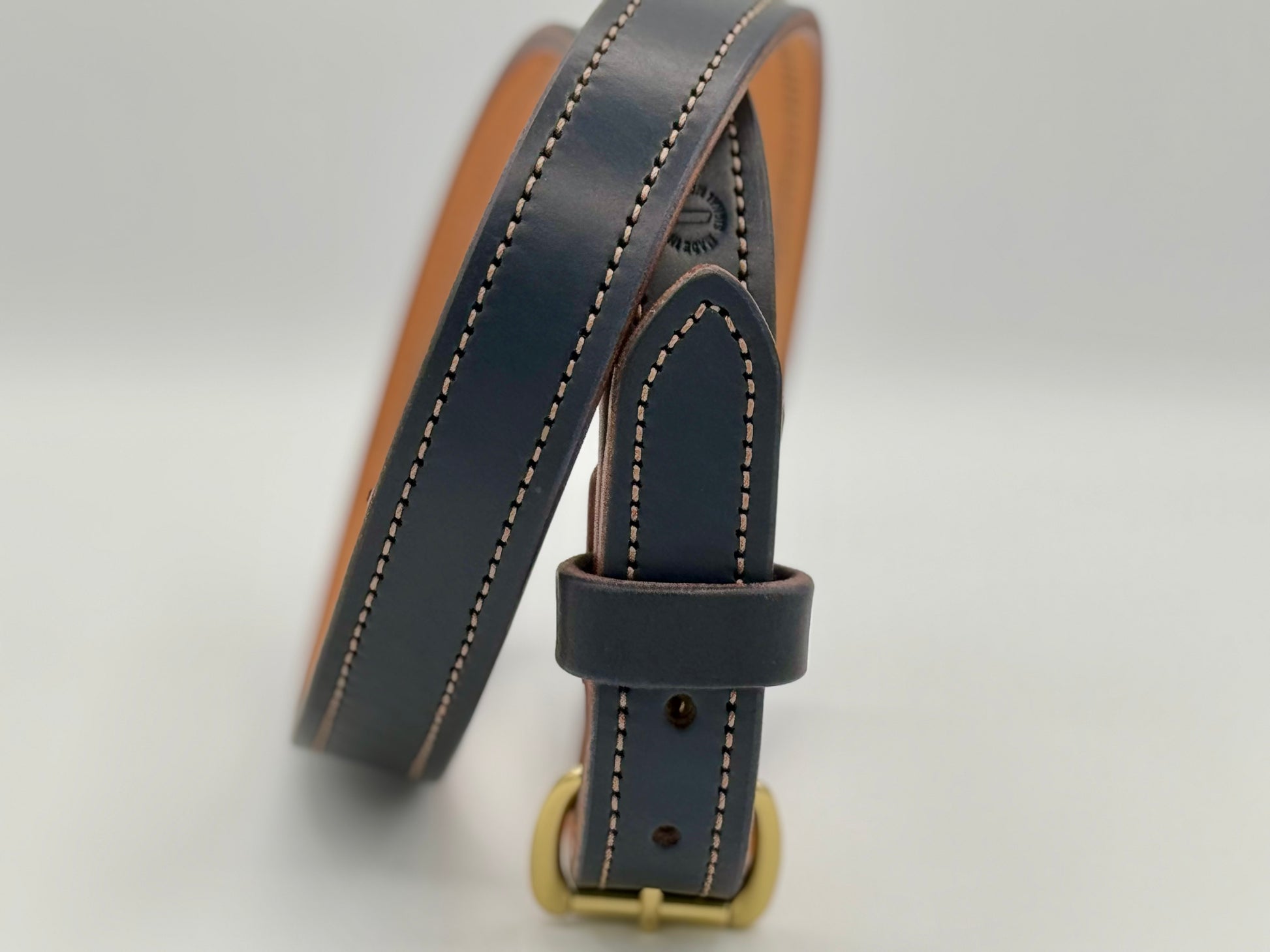 If you believe, as we do, that the best things are made with character and soul, The Midnight Edge carries that legacy forward., The Midnight Edge is built for you. Cut from the same deep blue Wickett & Craig bridle leather as its wider brother, this 1.25" version brings a sharper, more refined profile. Two layers of premium leather - 12 oz paired with 6 oz - create a stout yet supple 18 oz build. The hand-burnished edges, tobacco Latigo keeper, and elegant tapered tip give it a clean, confident silhouette that pairs as well with denim as it does with dress trousers.